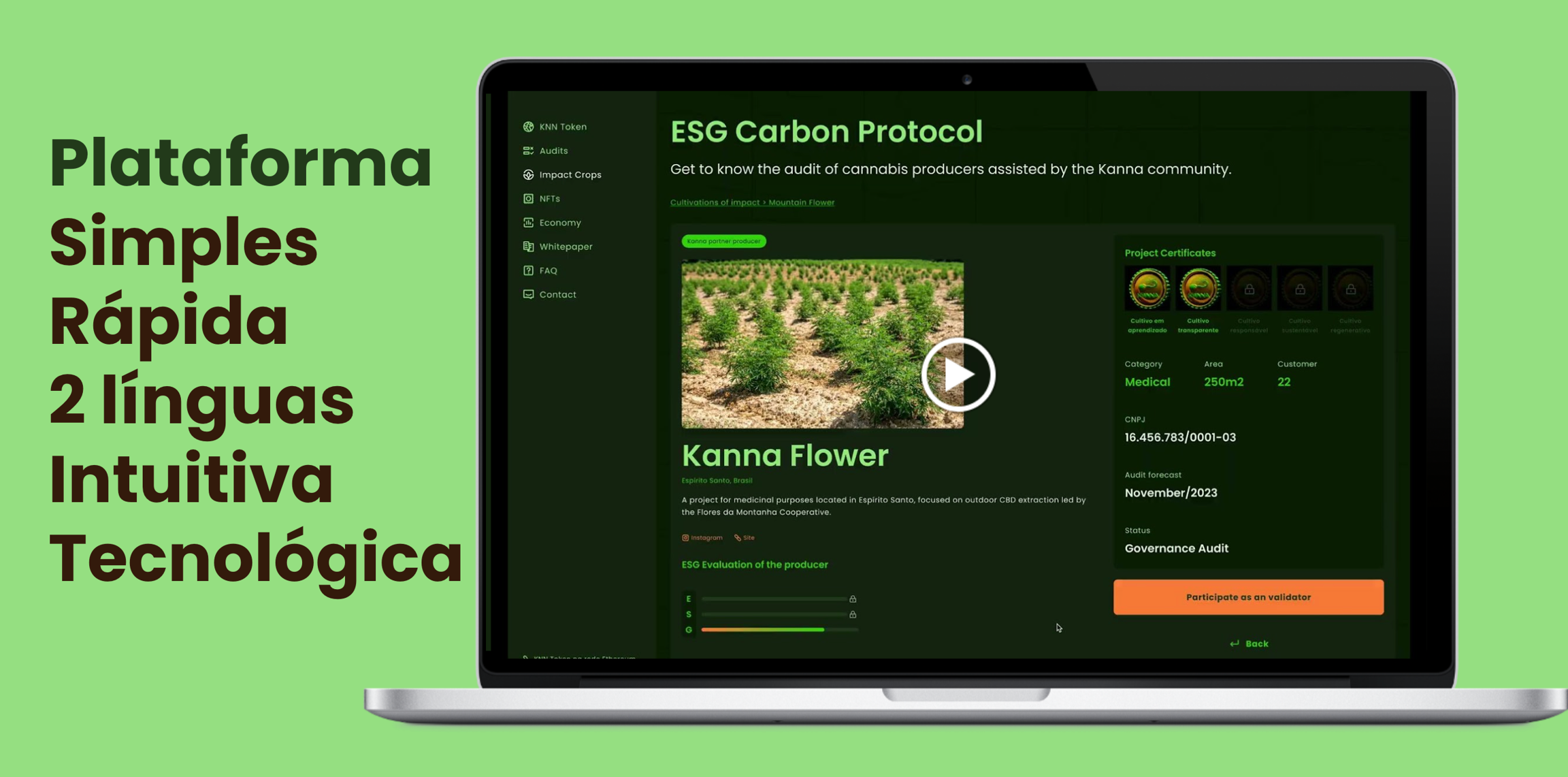 La presentación de información y evidencias es realizada por el productor o por un profesional autorizado para la recolección. Kanna no solicita que los validadores verifiquen las pruebas en el sitio. Todo el proceso de evaluación se lleva a cabo a través de la plataforma y la tecnología de Kanna.
